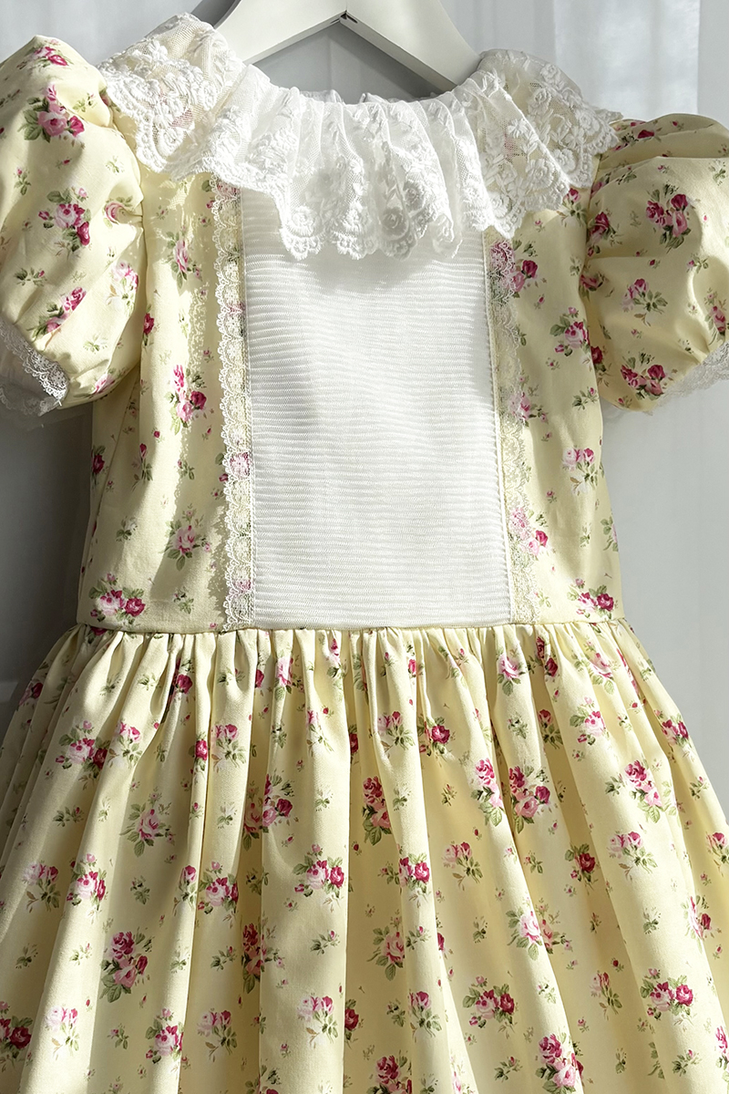 Rochie din bumbac* imprimat cu flori și detalii din tulle plisat si dantelă brodată albă, perfectă pentru momente speciale, evenimente sau ședințe foto.
